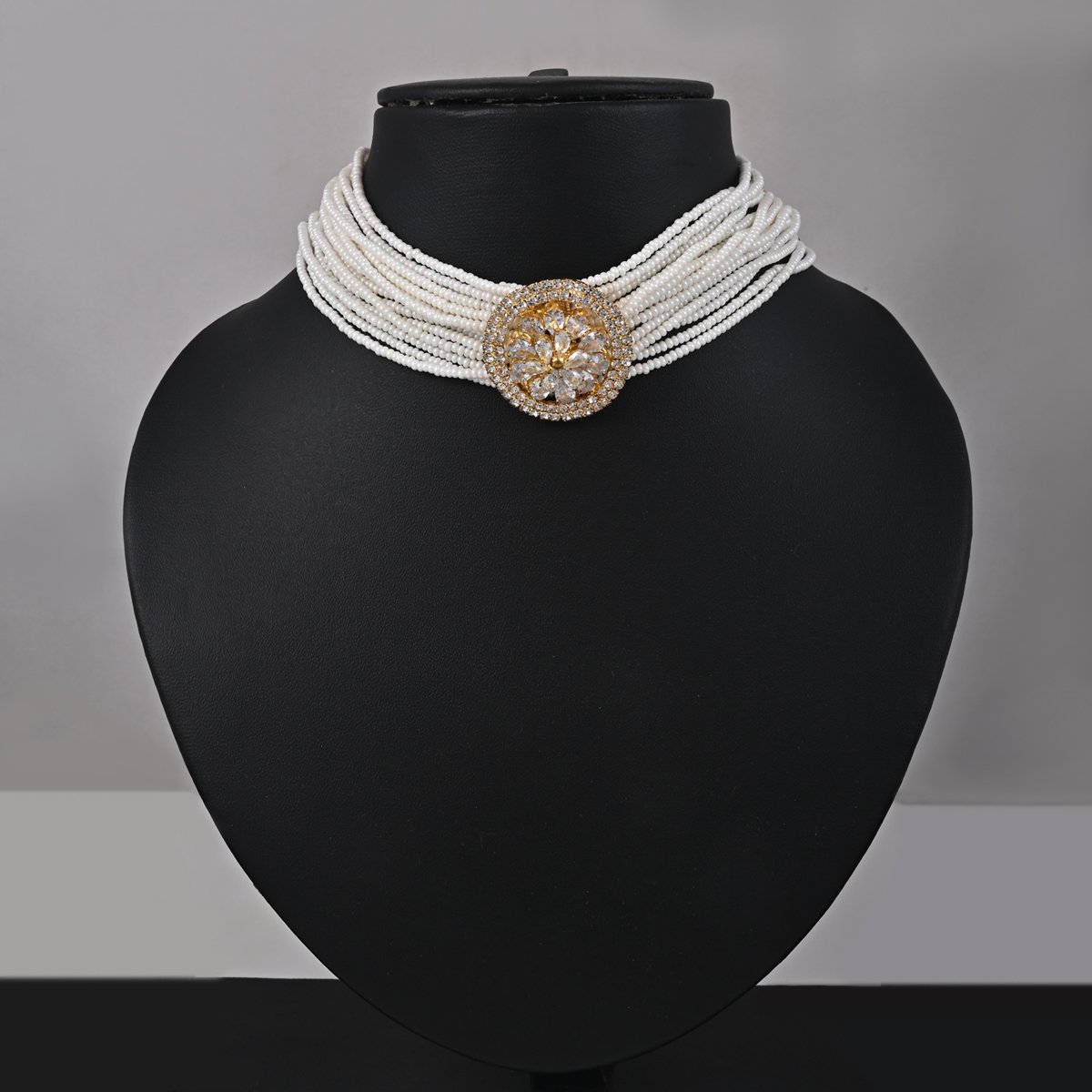 A perfect blend of grace and grandeur, our Elegant Pearl Mala Choker Set is crafted to turn heads. This exquisite set features a beautifully strung pearl bead mala, adorned with a statement round floral pendant at the center, fully encrusted with sparkling white Cubic Zirconia stones for a luxurious finish.